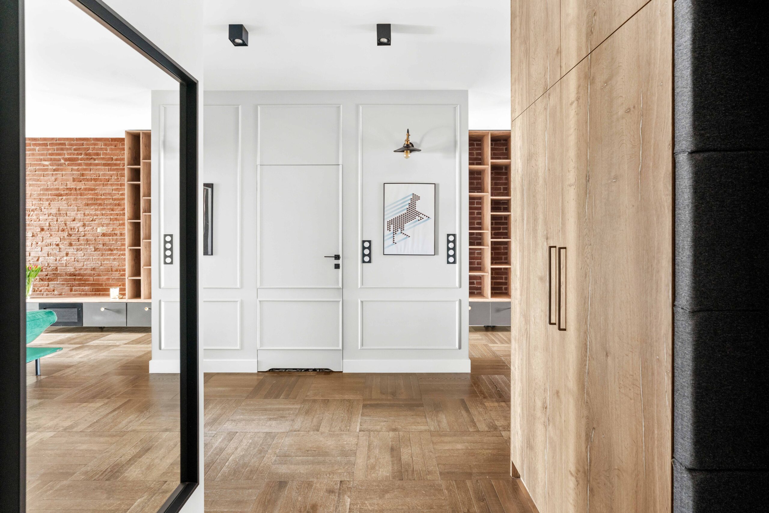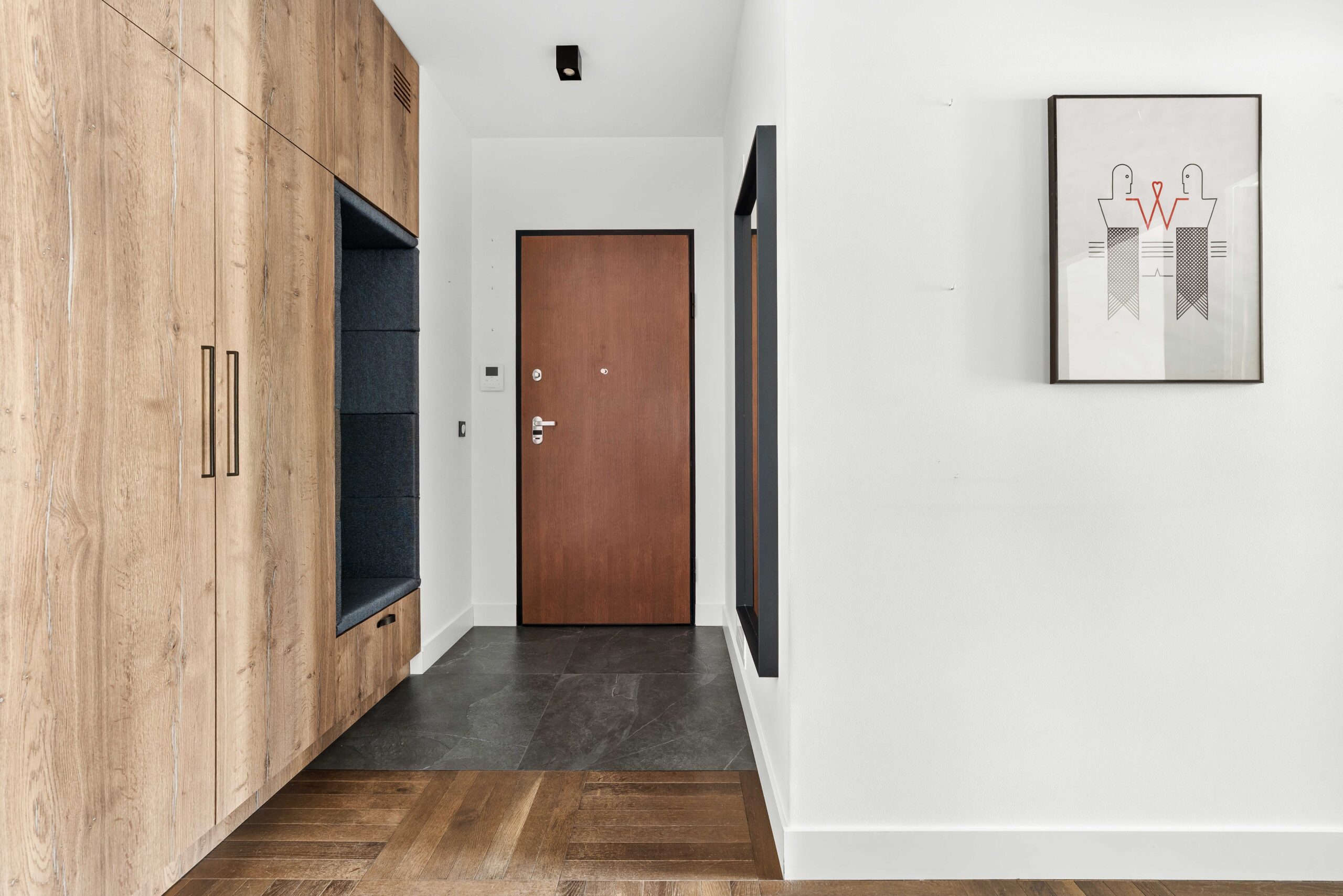 • W hallu wejściowym znajduje się pojemna zabudowa na wymiar (szafy na odzież wierzchnią i obuwie) oraz wygodne, tapicerowane siedzisko.