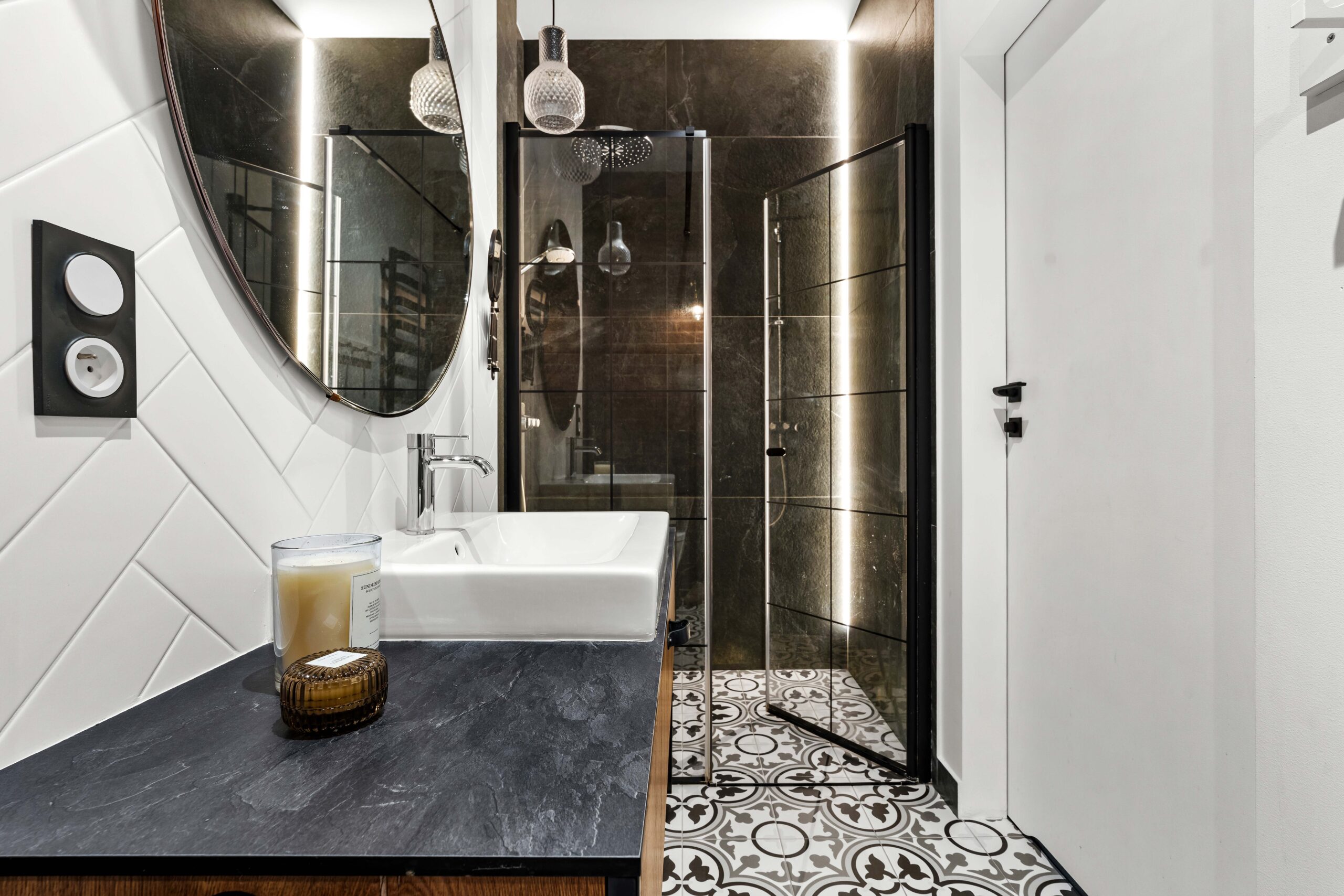 • Nowoczesna łazienka wyposażona w duży prysznic typu walk-in oraz armaturę wysokiej jakości.