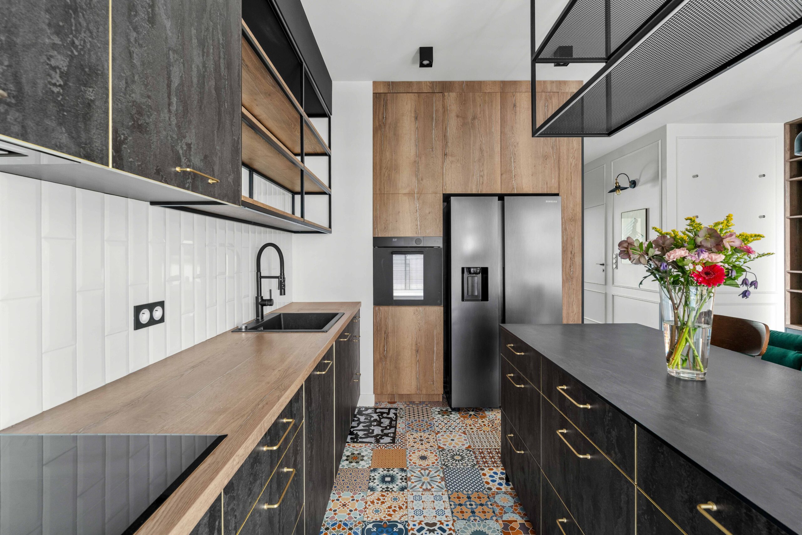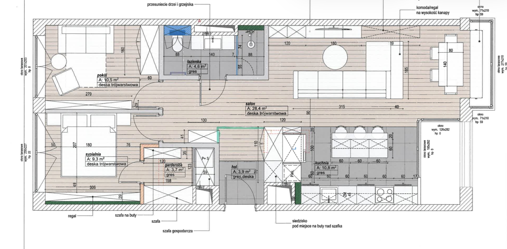 • Podłoga: Wysokiej jakości parkiet jaworowy (olejowany), ułożony w efektowną szachownicę.