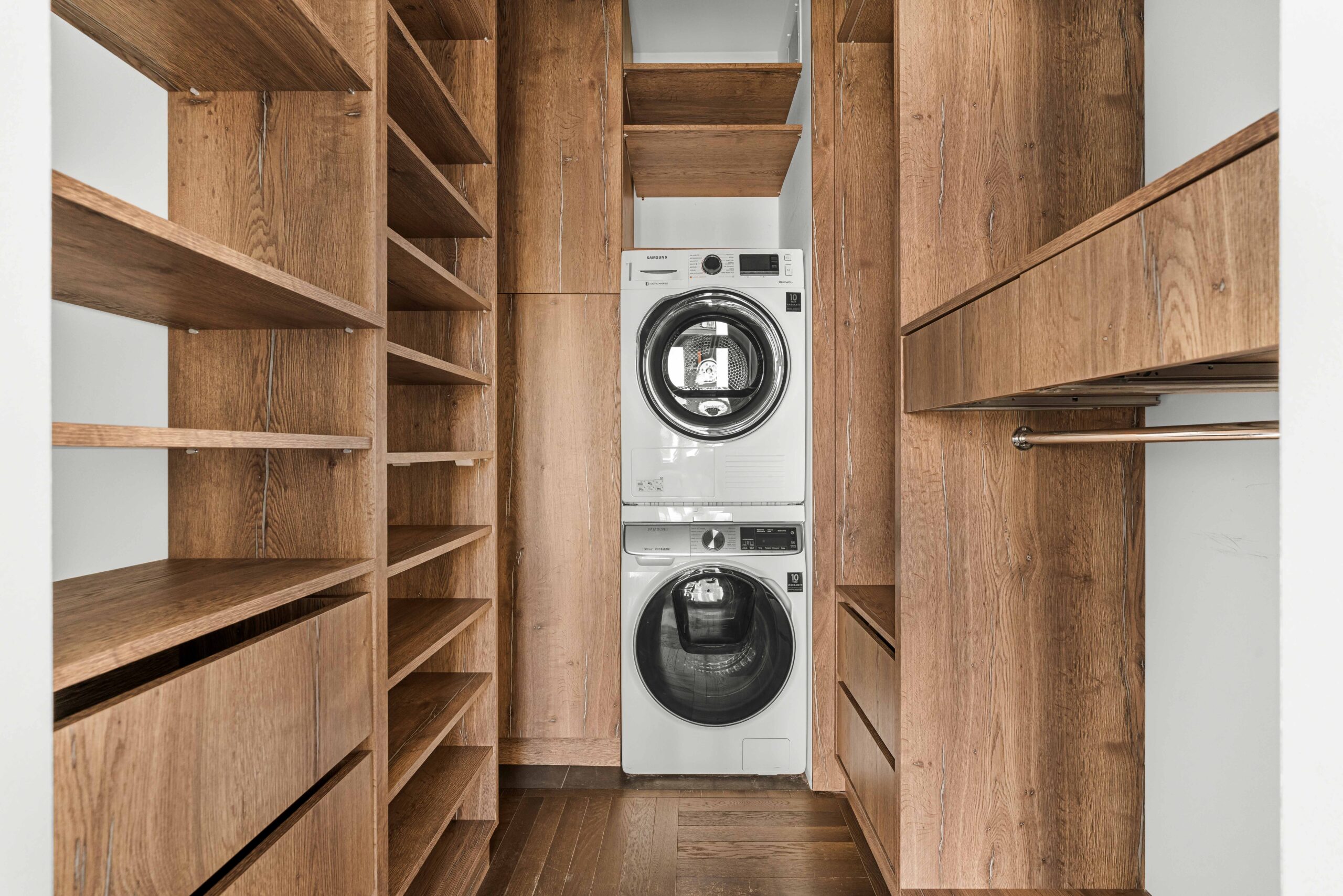• Garderoba: Przestronna i ukryta, z wydzielonym miejscem na pralkę oraz suszarkę marki Samsung.