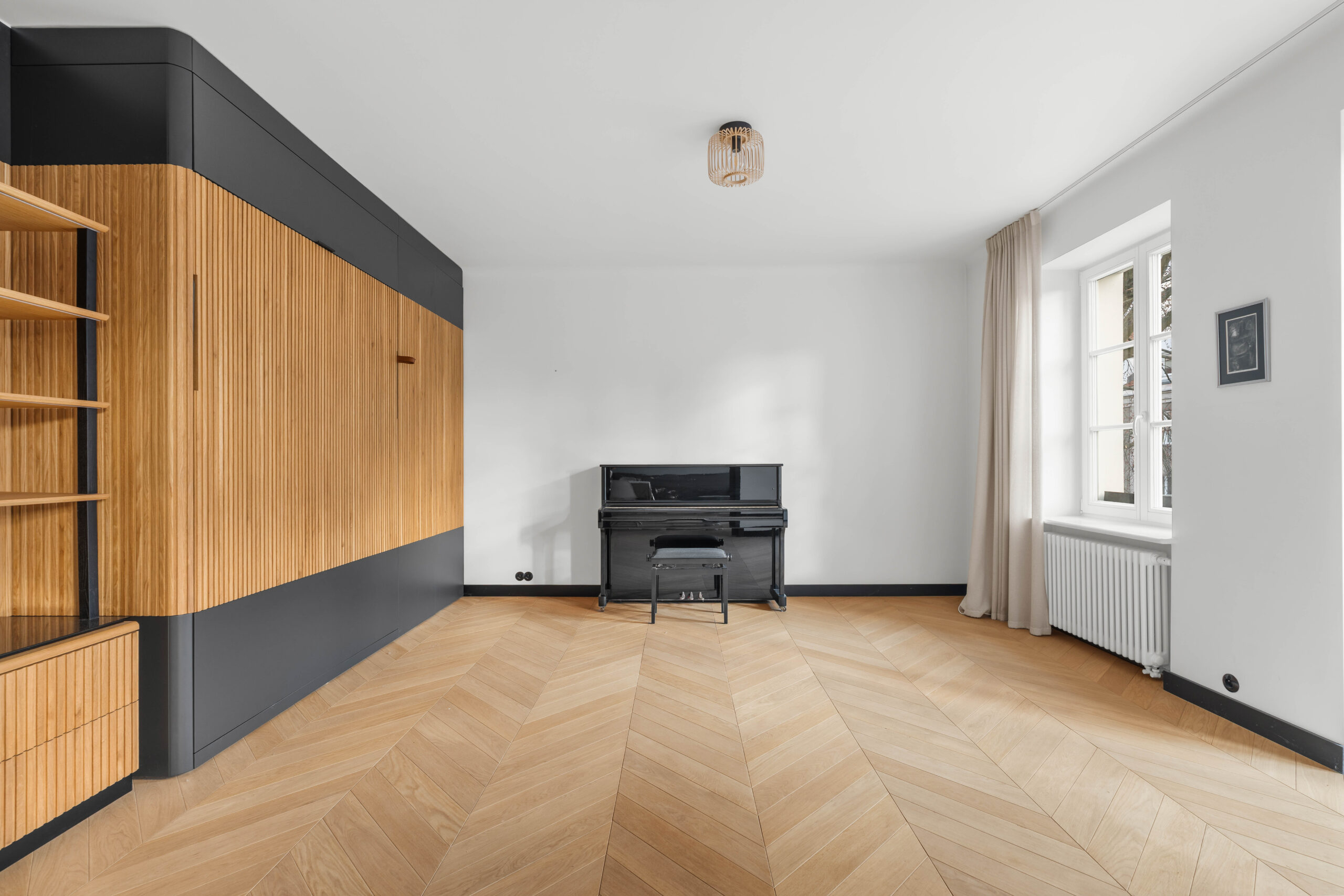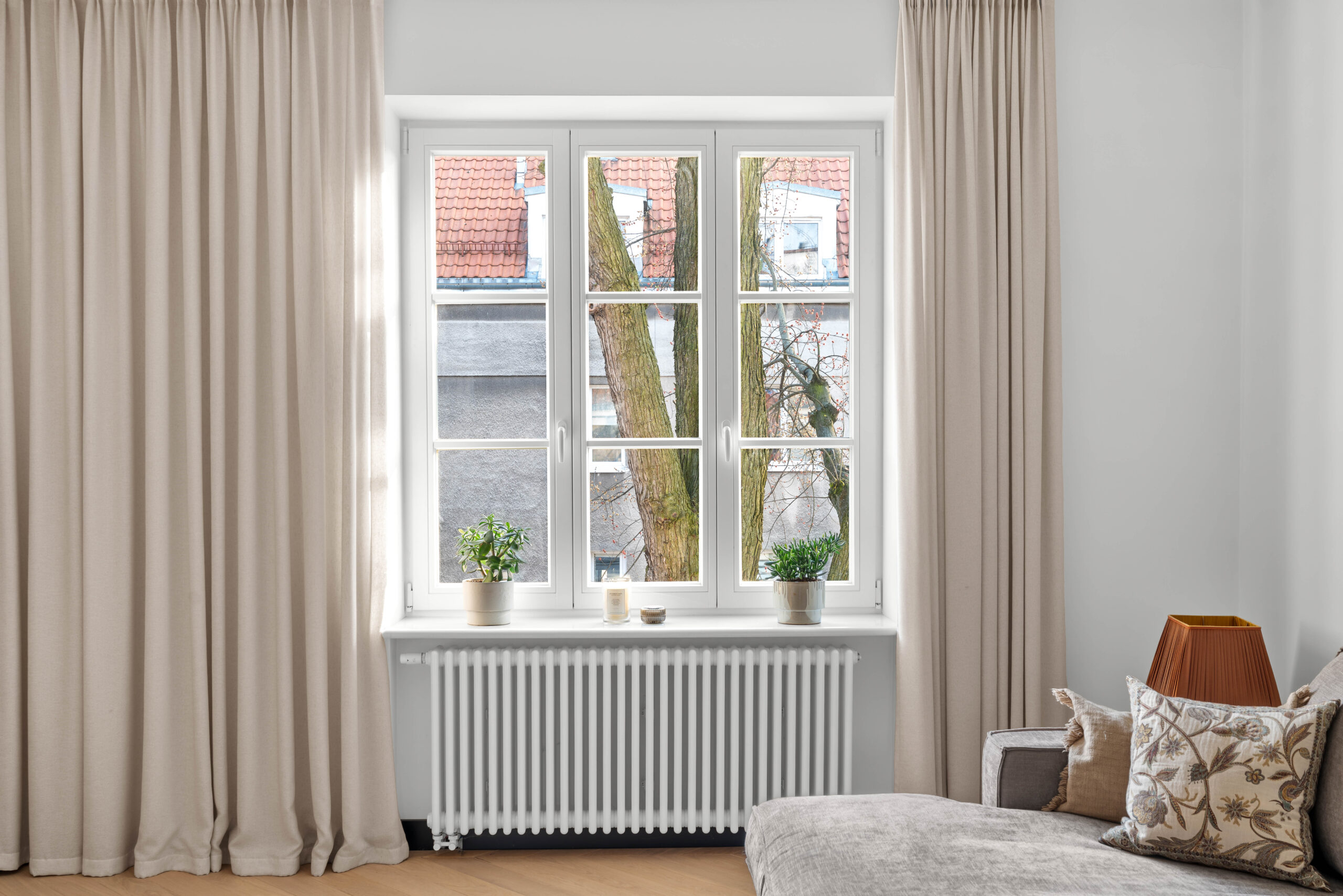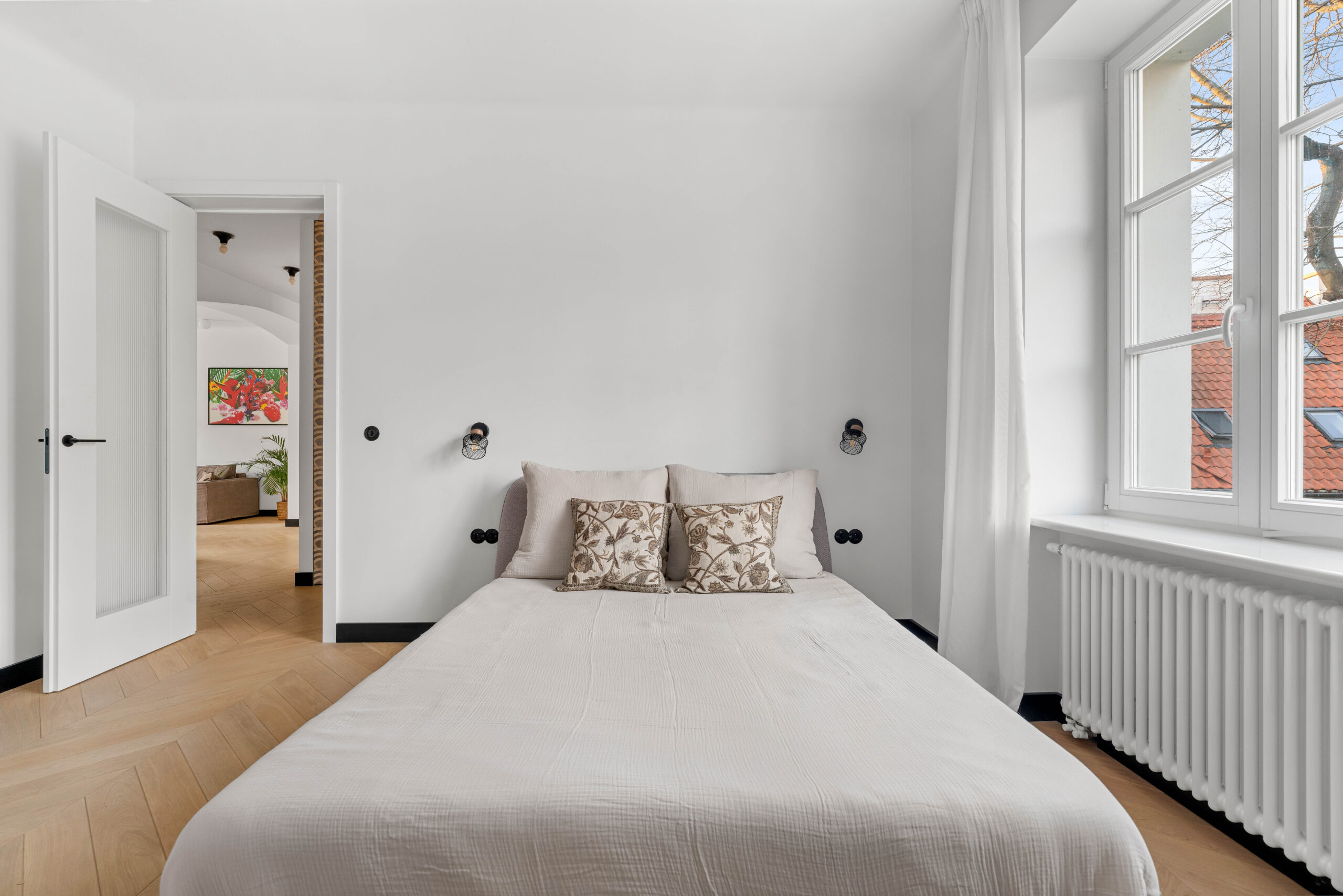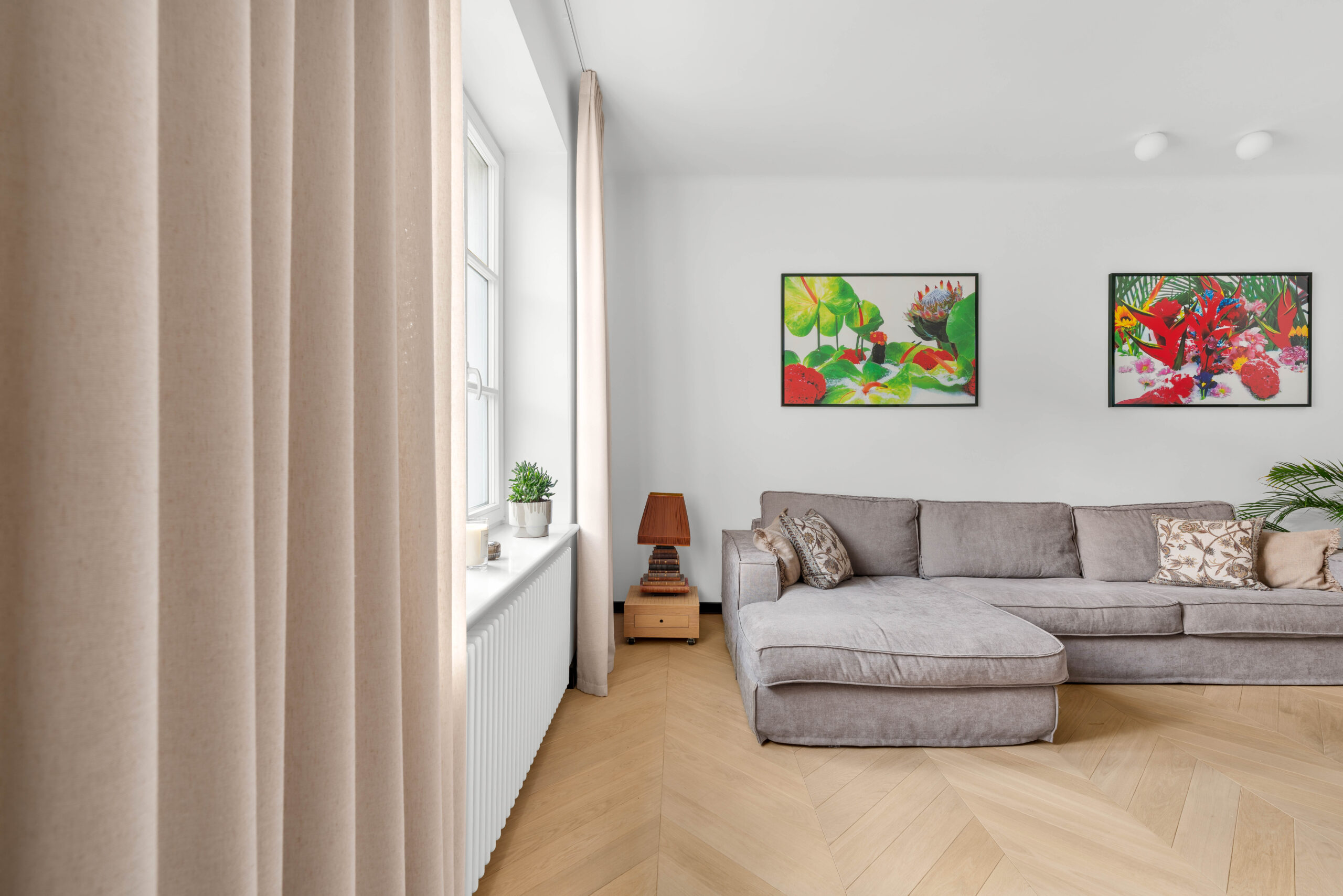 - Detale: Wysokie, drewniane drzwi wewnętrzne (na wymiar), art.-decowskie kaloryfery, ceramiczne kontakty (Berker), lniane zasłony szyte na miarę.