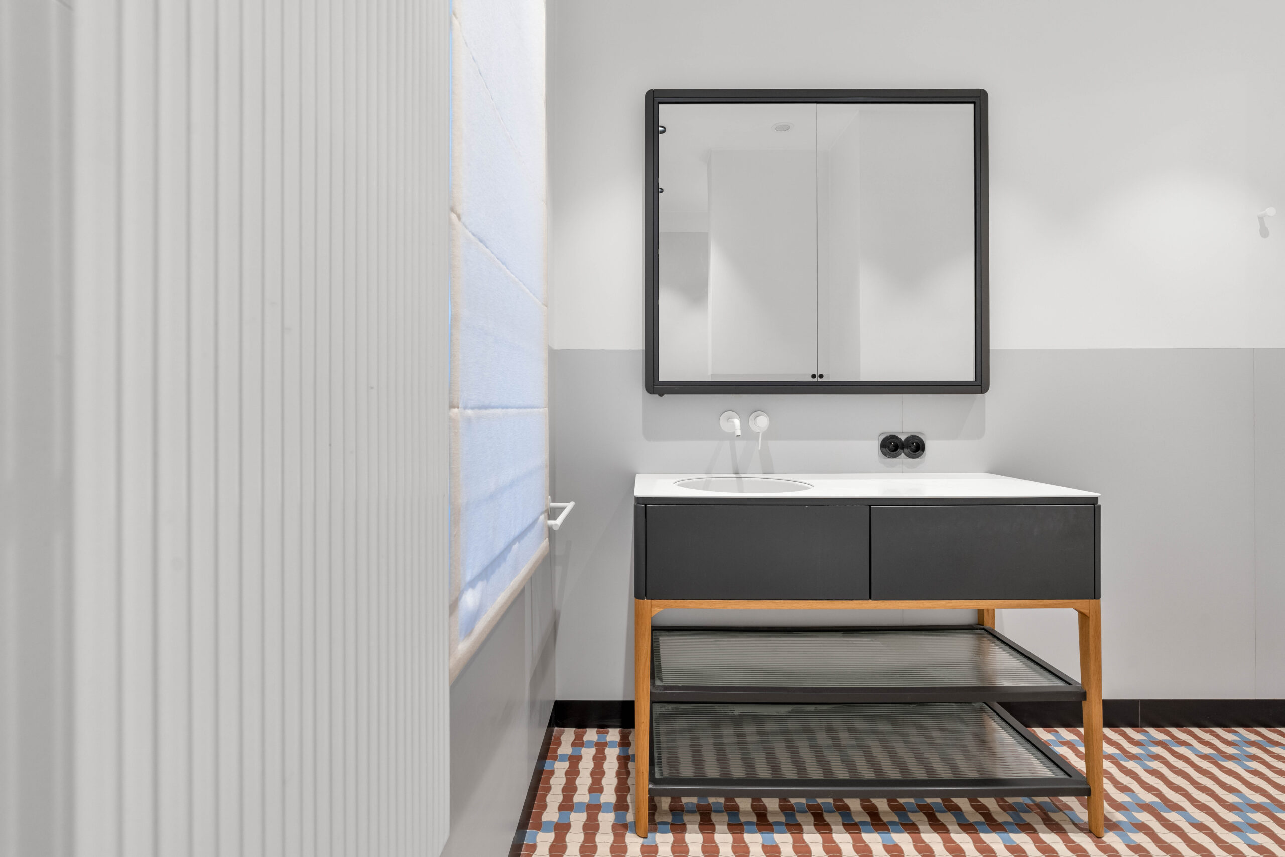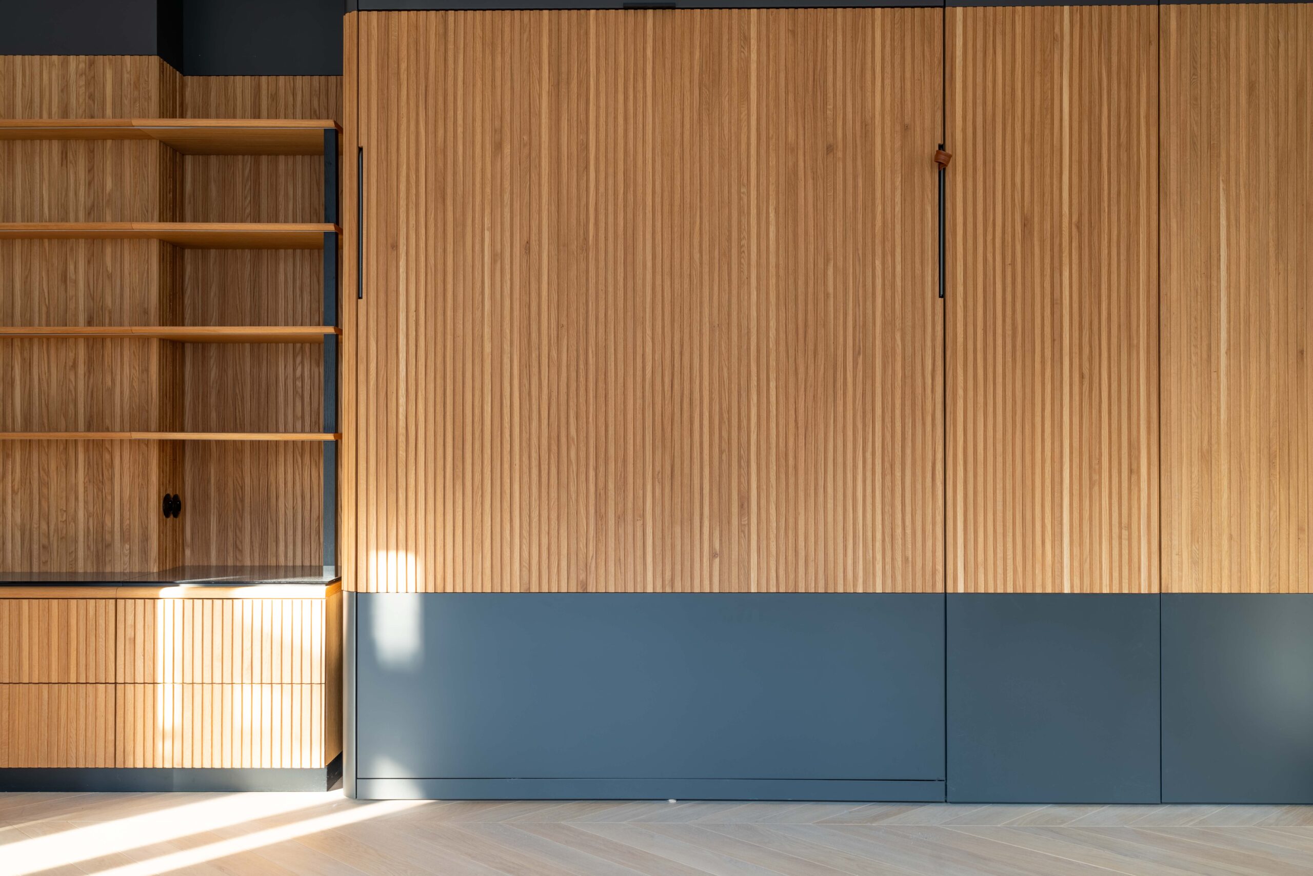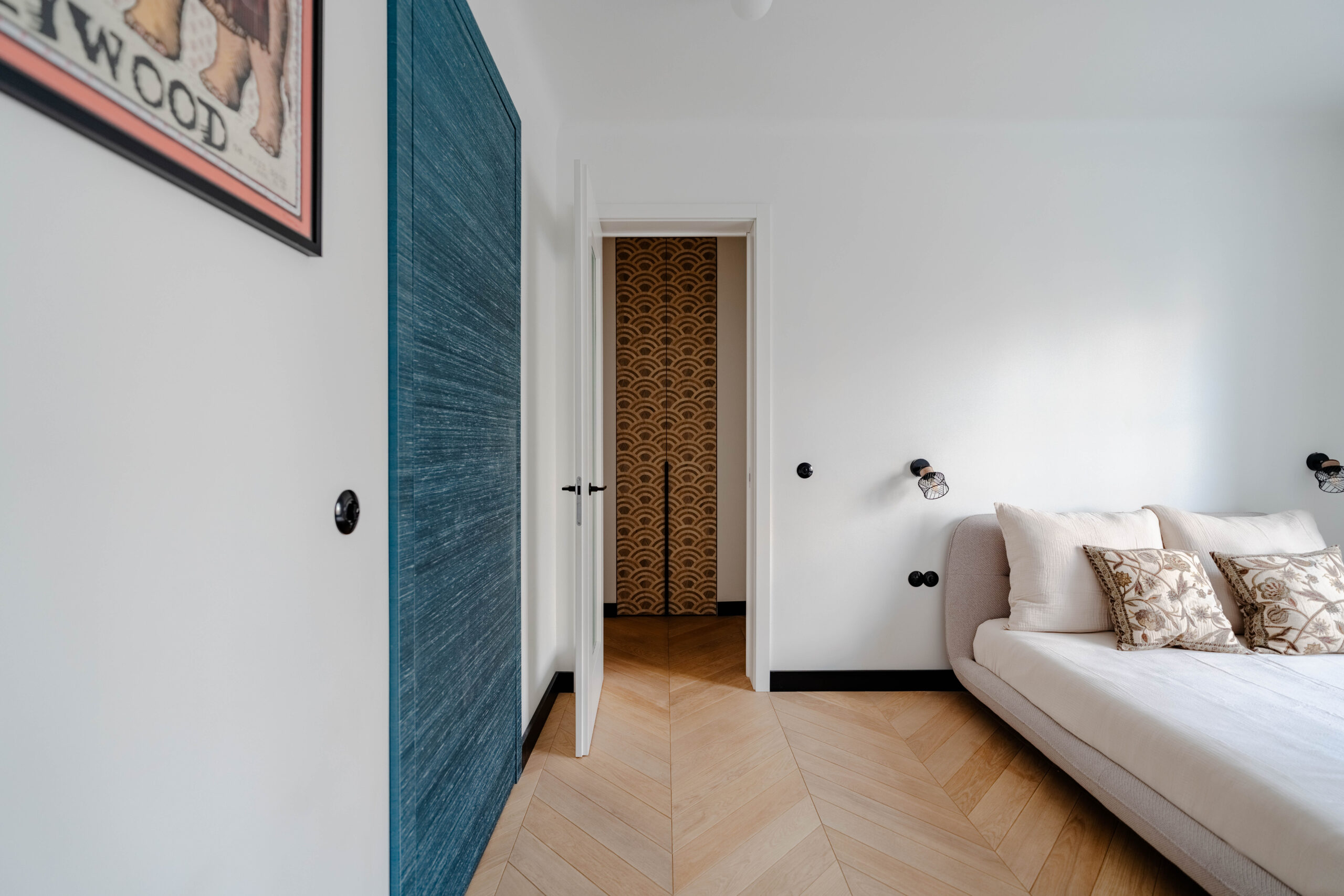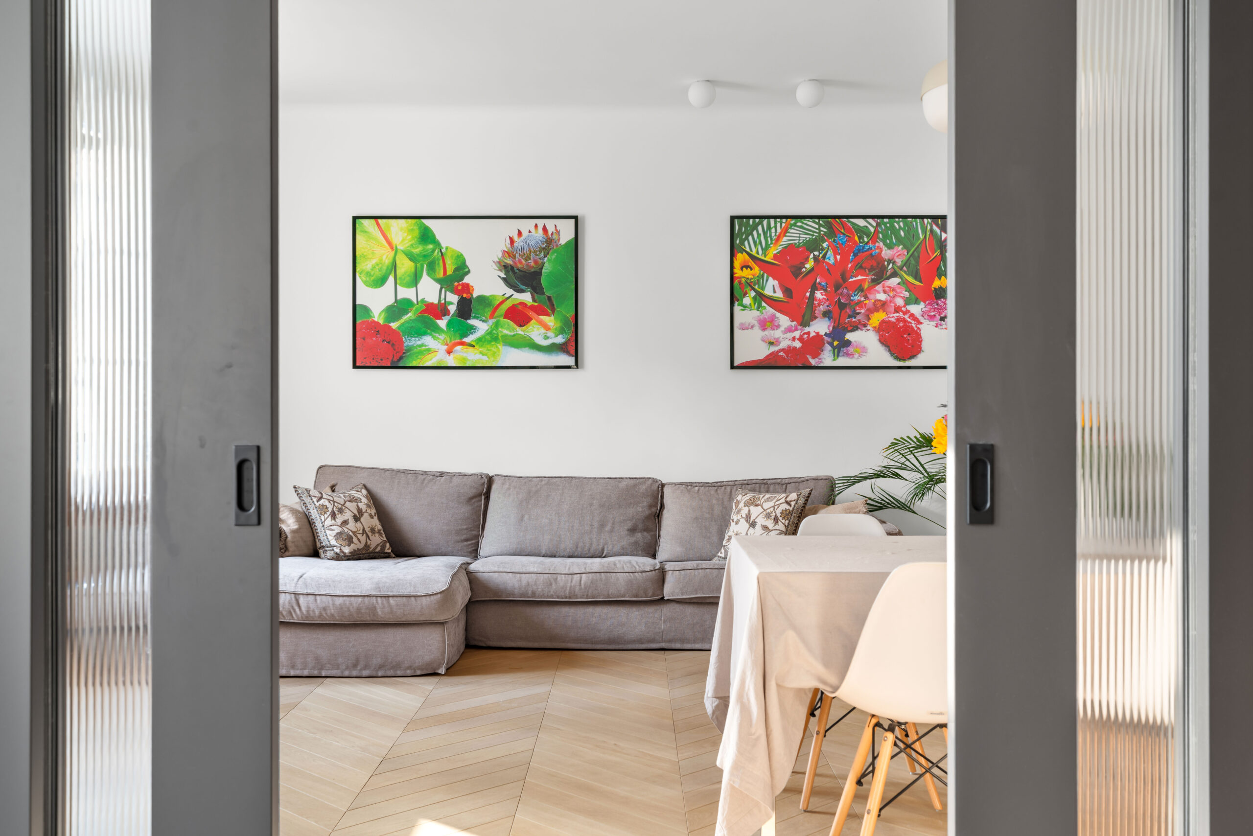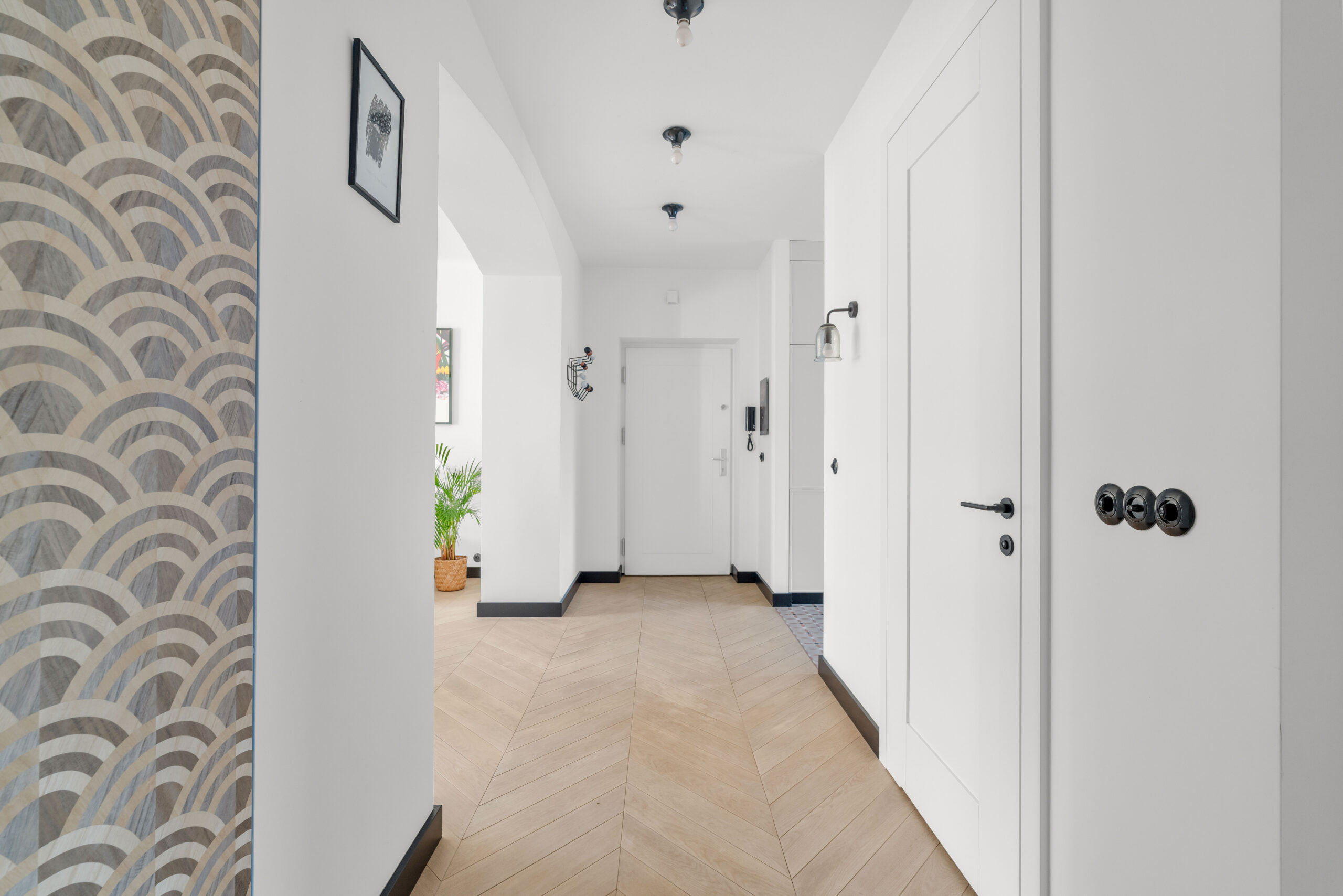 - Funkcjonalność: Przestronna garderoba oraz dodatkowa, wydzielona przesuwnymi, robionymi na zamówienie drzwiami część salonu z wbudowanym łóżkiem małżeńskim (idealne jako pokój gościnny).